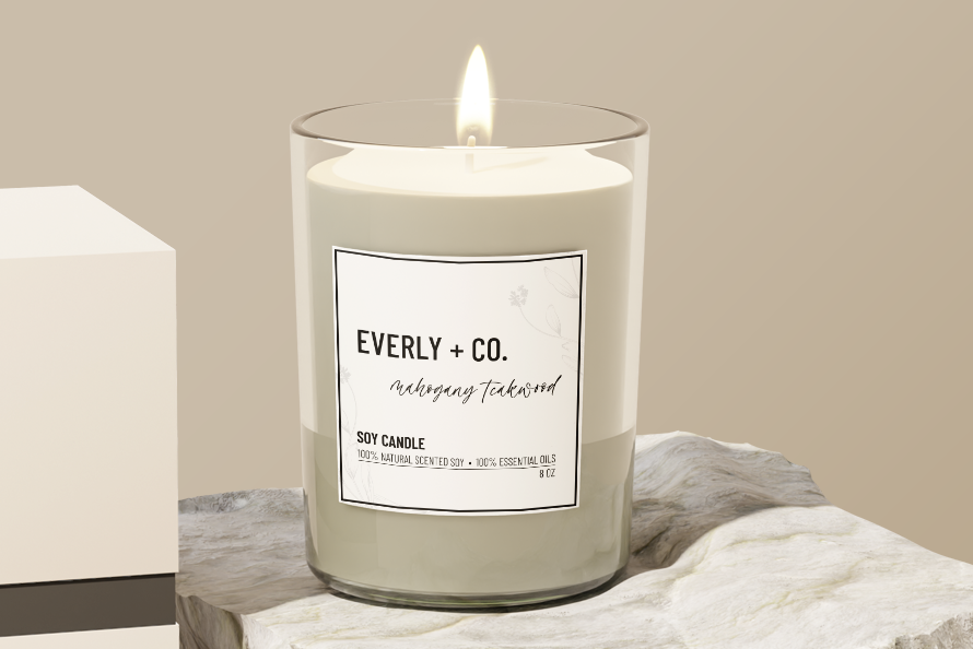 Key Features: – Branding: The label prominently displays the brand name “EVERLY + CO.” in bold, modern typography for a polished and professional look. – Scent Highlight: Each candle’s scent, such as “Mahogany Teakwood,” is beautifully showcased in an elegant, handwritten script font. – Material Selection: A textured, matte label enhances the tactile experience and aligns with the natural theme. – Details: Clear, concise information about the product—”100% Natural Scented Soy,” “100% Essential Oils,” and size (8 oz)—is included in clean, legible text. – Botanical Touches: Subtle botanical illustrations in the background add a layer of artistry without overpowering the design.